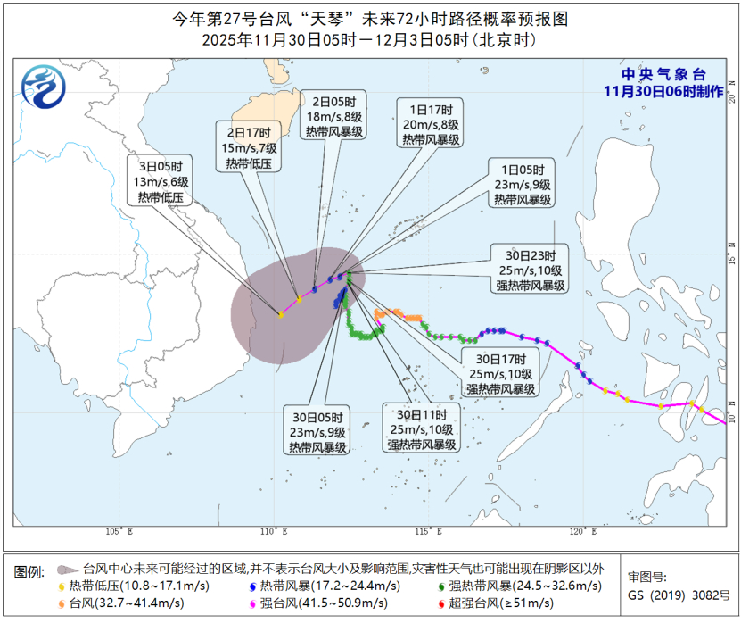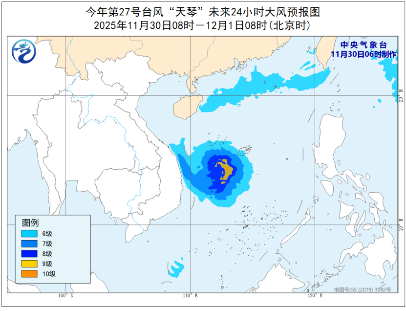 齐邦年夜风预告图(11月30日08时-12月1日08时) 台风“天琴”持续感染北海 往年第27号台风“天琴”(暖带风波级)的重心即日(30日)拂晓5面钟位于海北省3沙市(西沙永兴岛)偏偏北方背年夜约325千米的北海东北部海里上,便是北纬13.9度、东经112.3度,焦点四周最年夜风力有9级(23米/秒),焦点最矮气呼呼压为990百帕,7级风圈半径160~200千米。估计,“天琴”将正在北海西部海里归旋少动,强度逐步削弱,2昼夜间将正在北海东北部海疆削弱消失,11月30日08时至12月1日08时,巴士海峡、北海西部战西南部及东沙群岛、西沙群岛、中沙群岛将有6级、阵风7级风,个中,北海东北部战中西部的个别海疆风力可达7~8级,阵风9级,“天琴”中央通过的四周海疆风力可达9~10级,阵风11~12级。西沙群岛、中沙群岛、黄岩岛四周海疆将有小到中雨,部分年夜雨。中心气呼呼象台11月30日06时持续颁布台风蓝色预警。